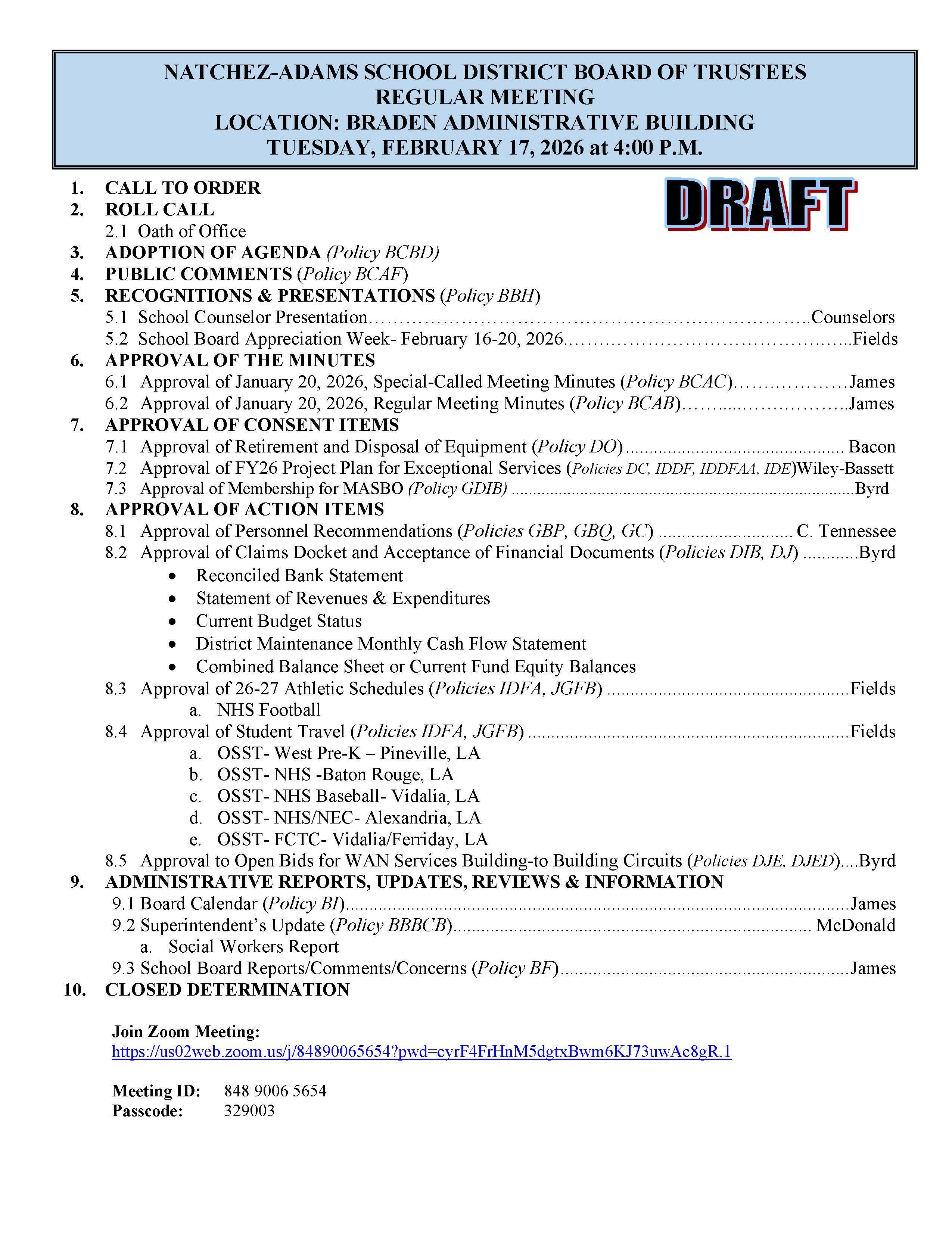 Natchez-Adams School District Board of Trustees Regular Board Meeting Click here to join Zoom Meeting:Meeting ID: 848 9006 5654Passcode: 329003 Published February 15, 2026 Print