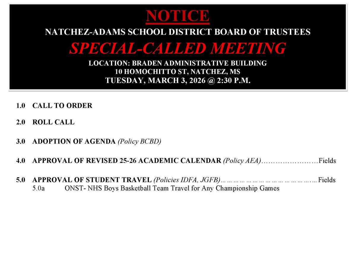 Natchez-Adams School District Special Called Board Meeting